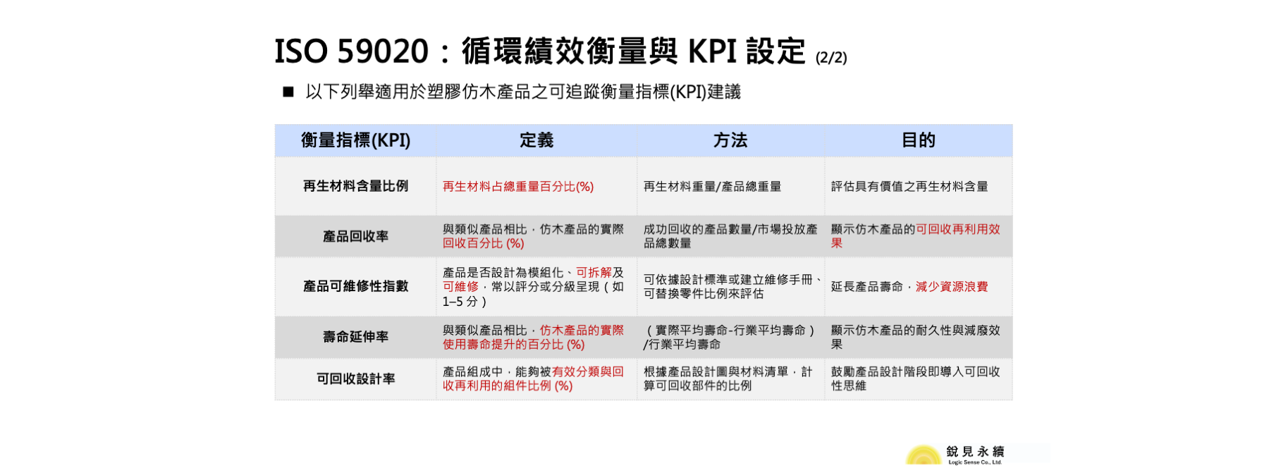ISO 59020 則著重於循環經濟的績效衡量與驗證,提供一套可量化的指標與方法,協助企業追蹤資源使用效率、再利用比例、產品壽命延伸率、廢棄物減量等關鍵成果。該標準不僅能作為內部績效管理的工具,也協助與國內外的永續揭露架構(如 GRI、TCFD)對接,提升數據的可比性與可信度。對於需要回應供應鏈客戶、投資人或監管機構的企業而言,ISO 59020 是將循環經濟成果轉化為透明且具公信力資訊的關鍵橋樑。