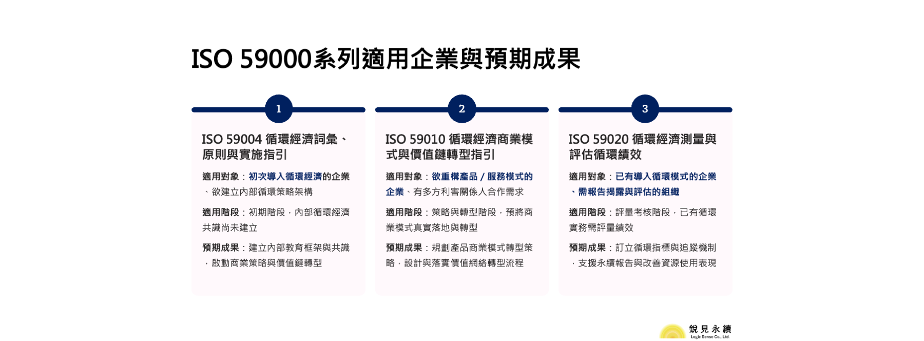 以下整理 ISO 59004、ISO 59010、ISO 59020 三大標準的內容要點、適用對象、導入階段與關鍵成果,協助企業快速抓重點,進行初步落點分析。