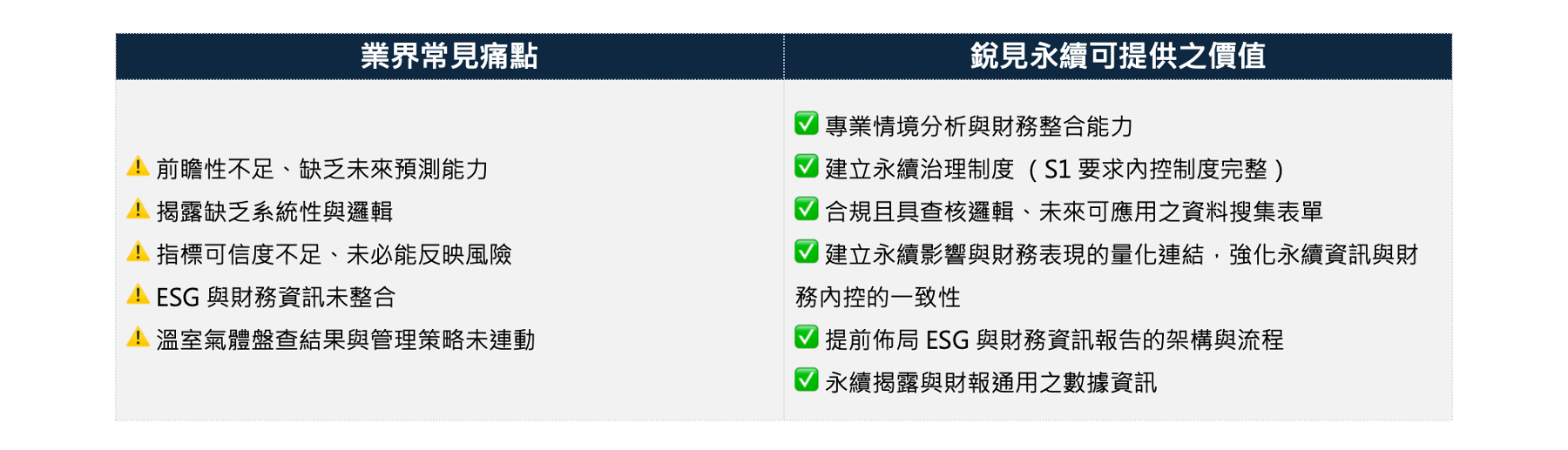 在過往 ESG、TCFD 與永續報告的經驗之上,許多企業其實已具備相當程度的制度與資料基礎。然而,當 IFRS 永續揭露準則進一步要求企業說清楚「哪些永續與氣候相關風險與機會,會實質影響企業的財務狀況、策略與未來價值」,企業往往才發現,既有內容難以直接回應準則所要求的揭露深度與結構,也因此難以轉換為可供決策使用的資訊。 這樣的落差,通常並不是因為企業未投入永續,而是因為永續資訊在被要求以「一般用途財務報導」的方式呈現時,現行資料架構與決策流程尚未完全對齊財報思維。