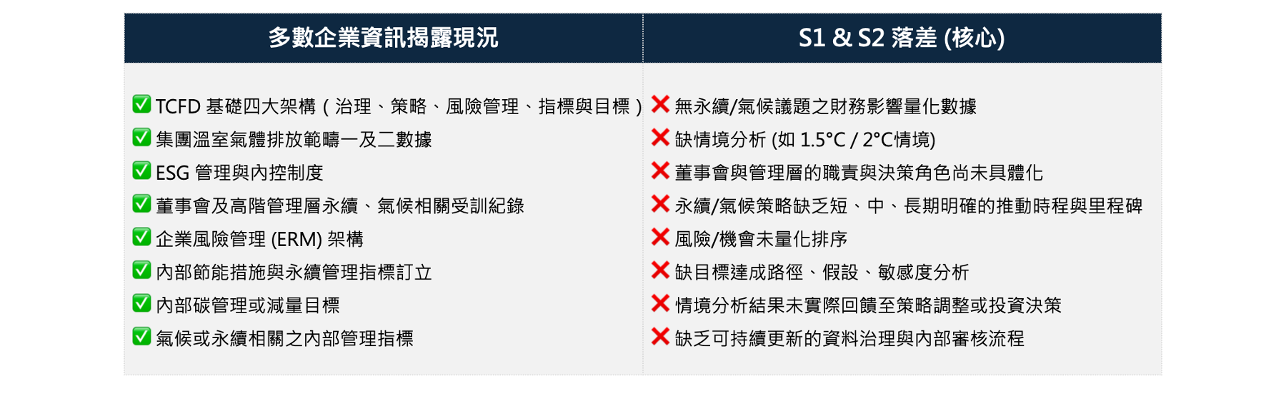 然而,要將以上轉換為符合 IFRS S1 與 S2 要求的財務相關資訊,才是真正的挑戰。常見的落差包括: